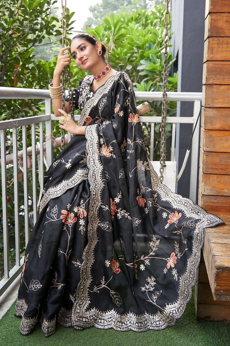 Elevate your style with our Black Tusser Saree and matching Tusser Blouse. The saree comes unstitched, allowing for customization, while the blouse is ready to wear. Both pieces feature heavy handwork embroidery, adding a luxurious touch to your ensemble. This stunning set is perfect for formal events and special occasions.